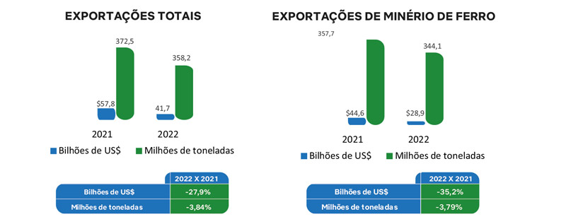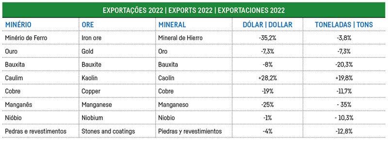 O minério de ferro respondeu por 69,3% das exportações em dólar. Ouro, cobre e nióbio foram responsáveis por 11,8%, 6,6% e 4,9%, respectivamente. As exportações de minério de ferro tiveram queda de 35%, em dólar, em 2022: de US$ 44,6 bilhões e 357,7 milhões de toneladas em 2021 para US$ 28,9 bilhões e 344,1 milhões de toneladas em 2022.