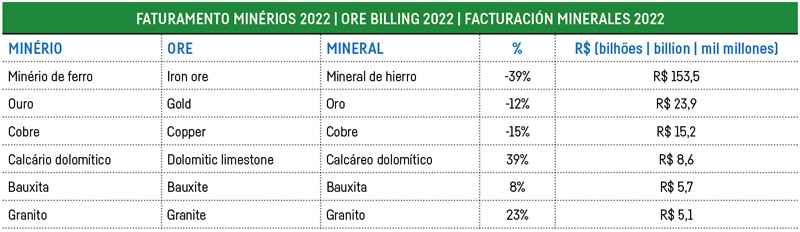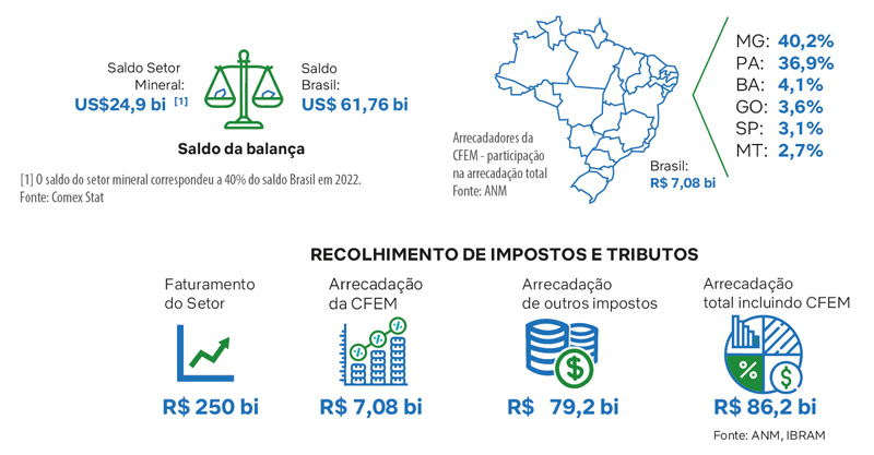 Em 2022, o setor mineral registrou queda de 26% no faturamento em relação ao 2021, totalizando R$ 250 bilhões (excluindo-se petróleo e gás). A arrecadação da CFEM totalizou R$ 7,08 bilhões, 32% menor que em 2021 (R$ 10,3 bilhões). As exportações minerais brasileiras alcançaram US$ 41,7 bilhões, queda de 27,9% em relação a 2021. O saldo comercial mineral, de quase US$ 24,9 bilhões equivale a 40% do saldo comercial brasileiro, que foi de US$ 61,8 bilhões.