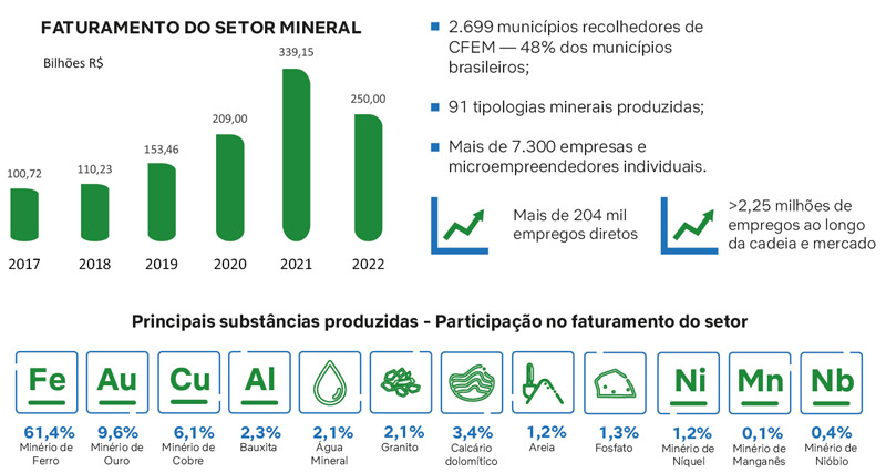 A mineração no Brasil, atividade que em 2022 respondeu por faturamento de R$ 250 bilhões, originado pela produção estimada de 1,05 bilhão de toneladas, recolheu R$ 86,2 bilhões em impostos e tributos totais e arrecadou R$ 7,08 bilhões de CFEM, congrega mais de 7.300 empresas e microempreendedores individuais, além de gerar mais de 204 mil empregos diretos.