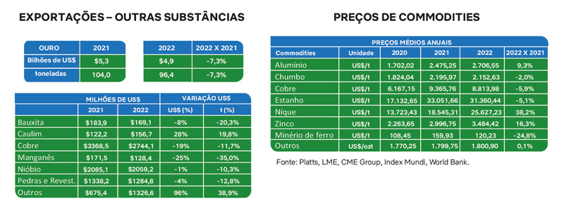 As quedas no faturamento em 2022 aconteceram após 2021 registrar aumento de 62% em relação ao ano de 2020, totalizando R$ 339,1 bilhões (excluindo-se petróleo e gás). A arrecadação da CFEM em 2021 totalizou R$ 10,3 bilhões, 69,2% maior que em 2020 (R$ 6,08 bilhões). As exportações minerais brasileiras alcançaram US$ 58 bilhões, aumento de 58,6% em relação a 2020. O saldo comercial mineral, de quase US$ 49 bilhões, apresentou contribuição crucial para manter positivo o saldo comercial do Brasil em 2021. O saldo mineral, que é a diferença entre as exportações e as importações de minérios, em 2021 foi equivalente a 80% do saldo comercial brasileiro, que foi de US$ 61 bilhões.
