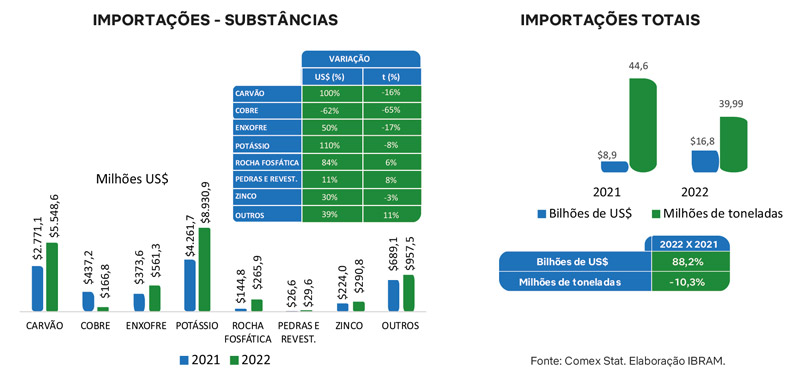 Quanto às importações de minérios, que caíram 10,3% em toneladas, corresponderam a cerca de 40 milhões de toneladas e exigiram dispêndio em dólar 88% superior, totalizando US$ 16,8 bilhões, em 2022. Coube ao potássio o primeiro posto nas importações minerais (53%), seguido pelo carvão (33%).